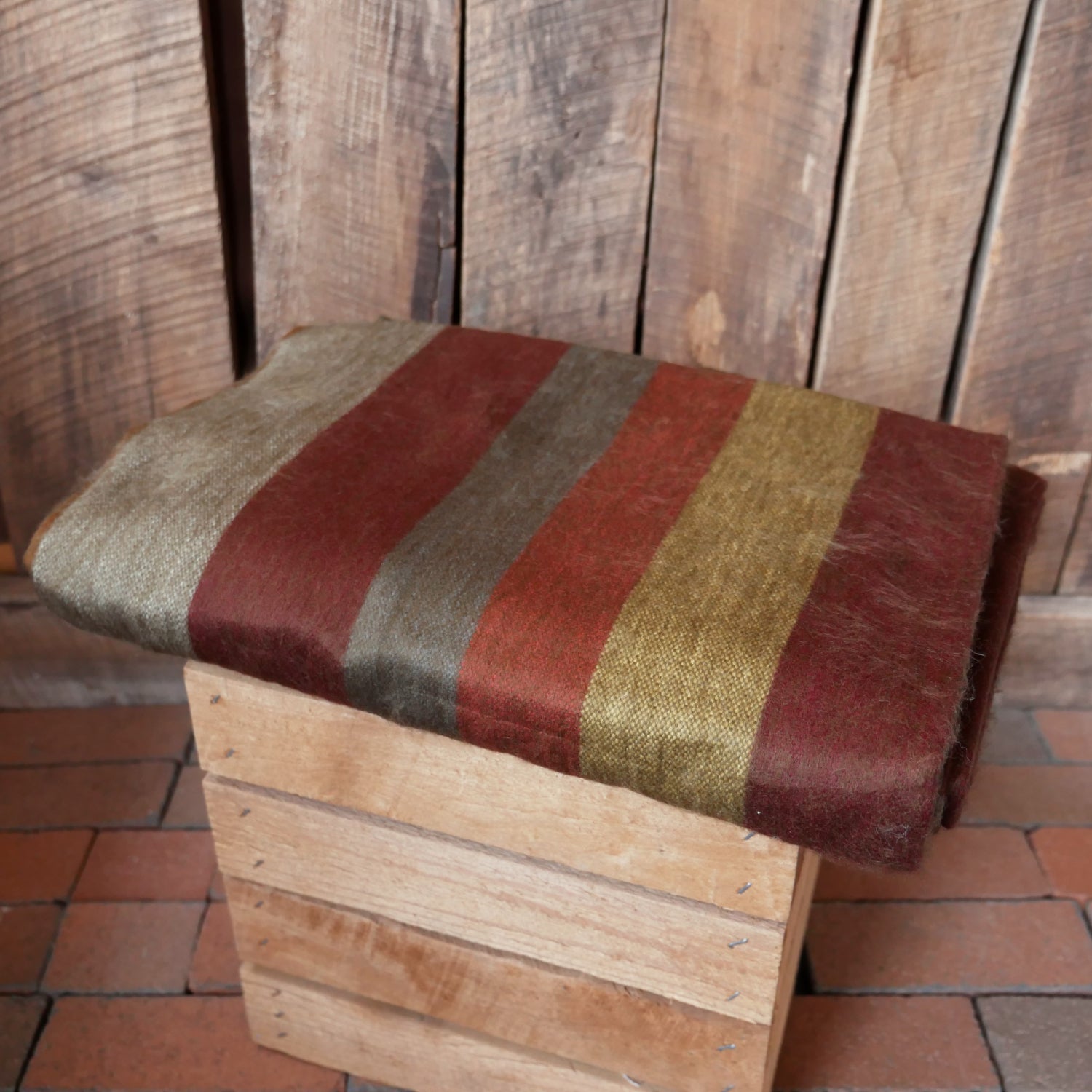 These alpaca wool blankets are lightweight, warm, and soft. The size is approximately 66" by 96" and they come a wide variety of colors and stripes. These weigh about 1.8lbs. The perfect thing for a chilly evening. 80% alpaca wool and 20% acrylic.