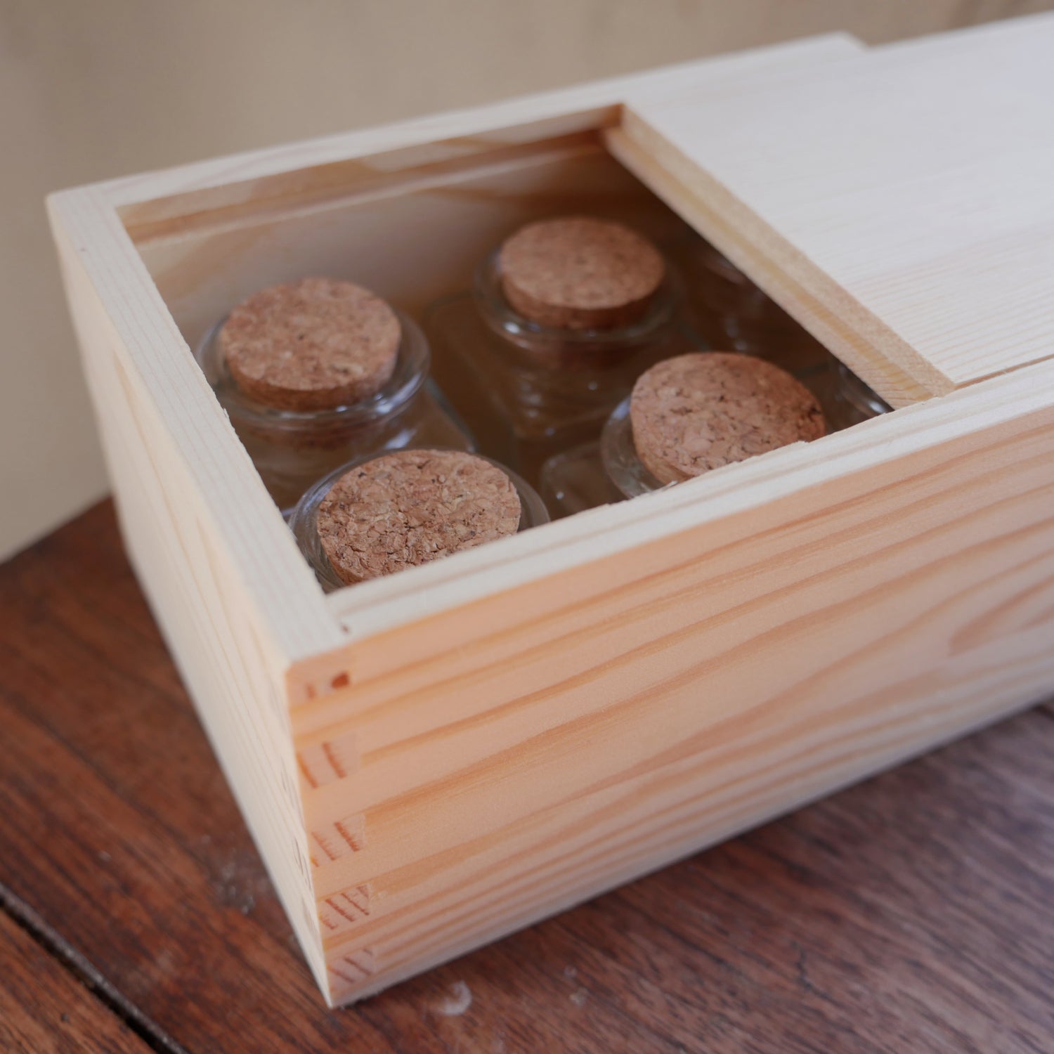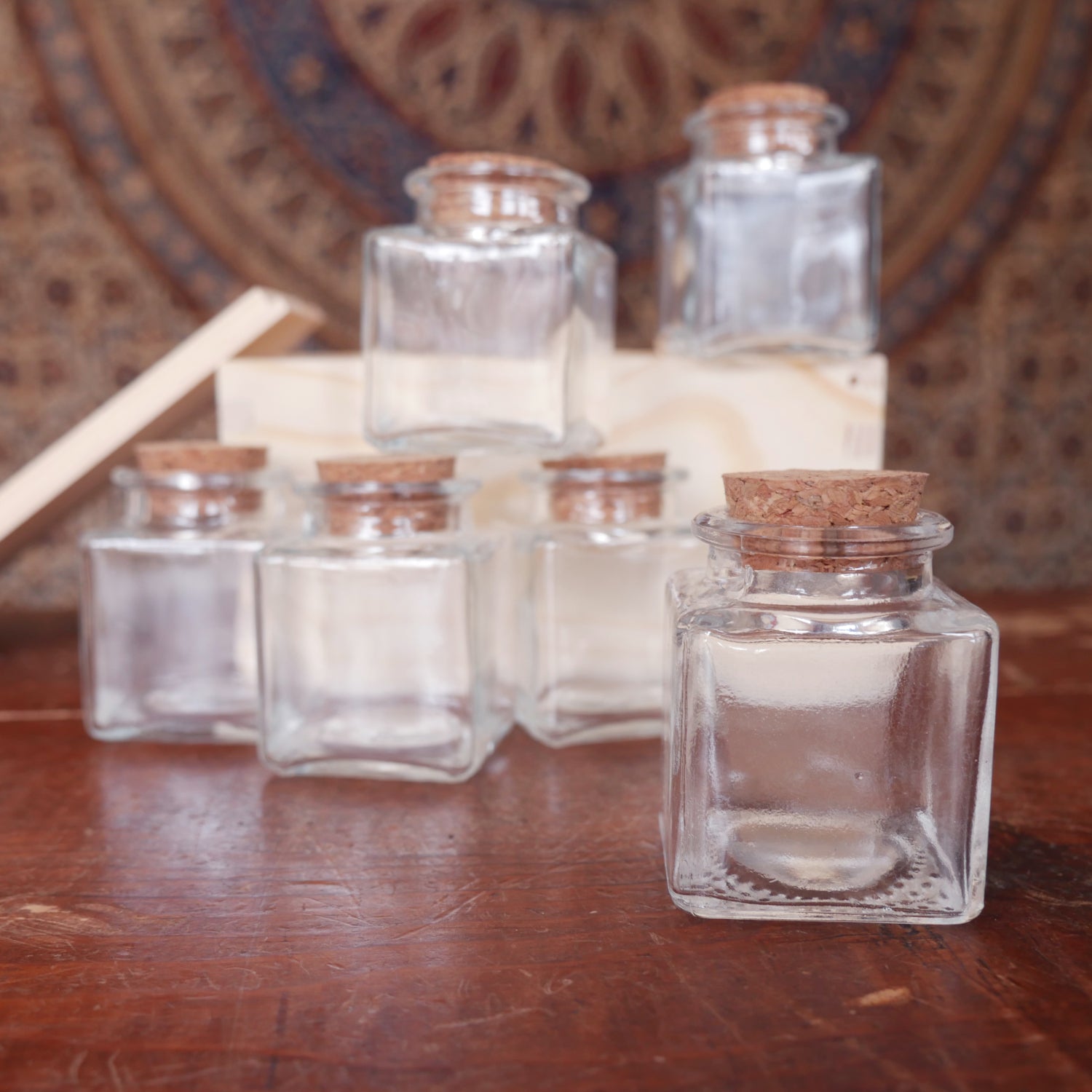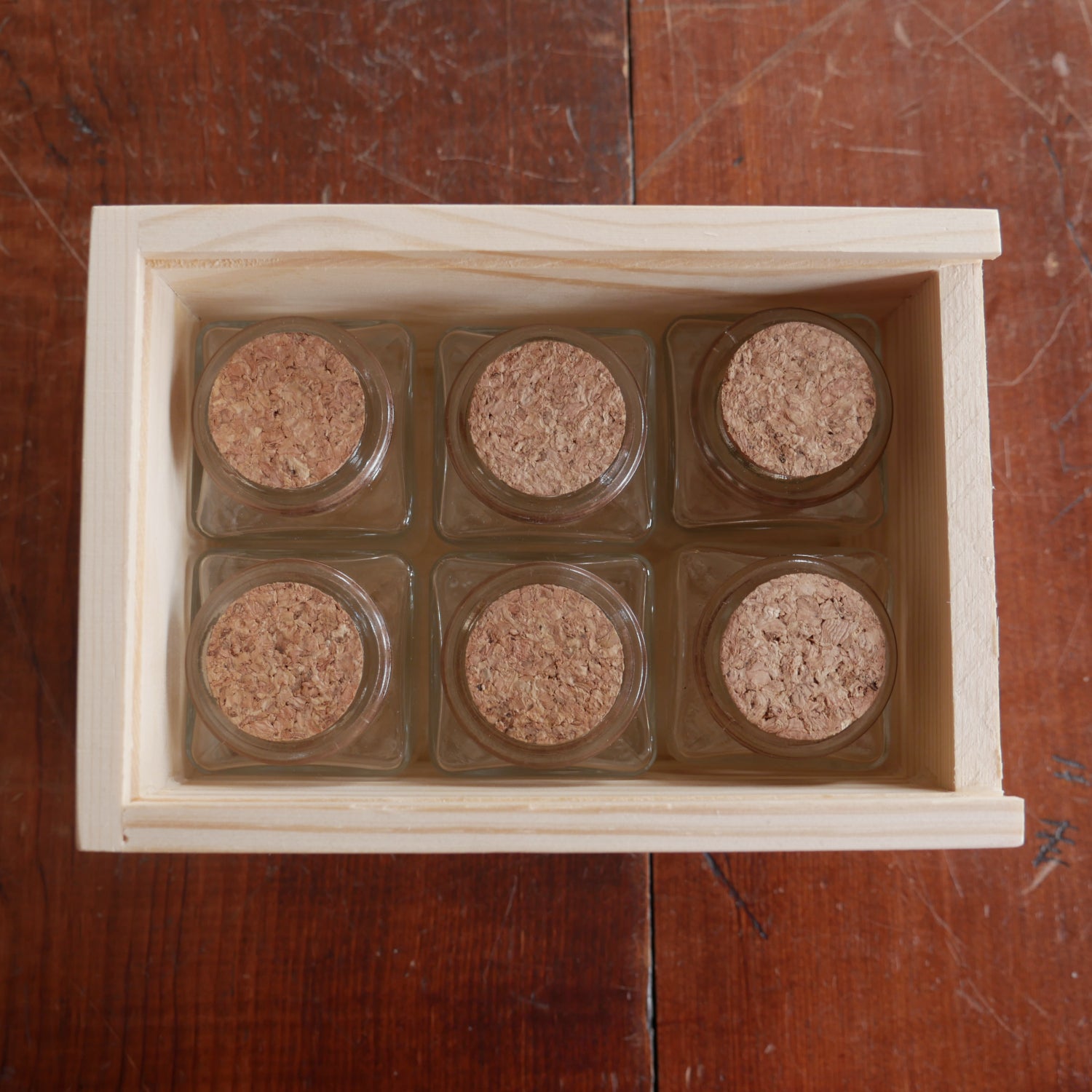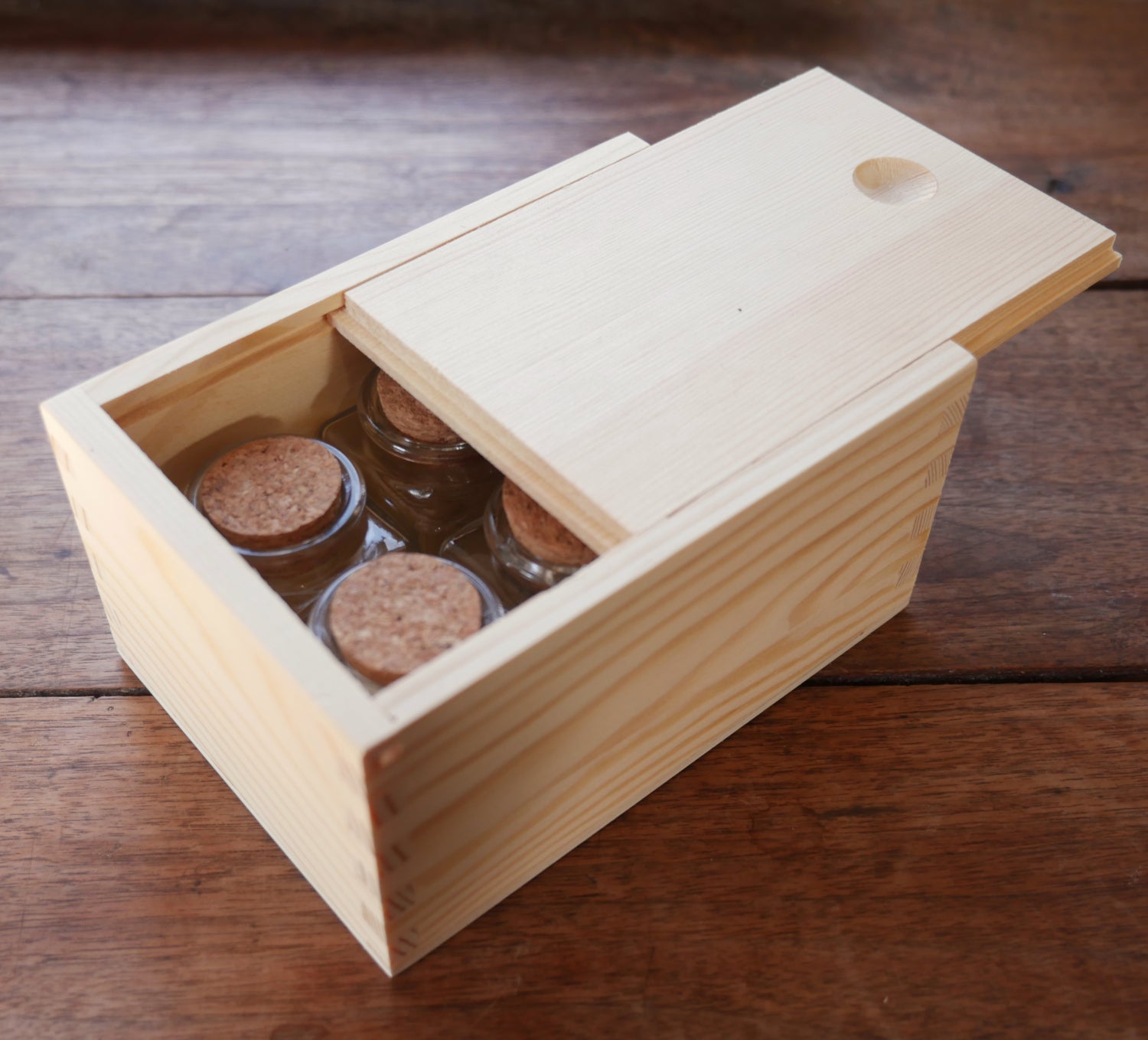 These slide-topped wooden boxes comes with a set of six 2 ounce glass bottles with corks, great for storing spices or other items. Interior dimensions 5-7/8" long 4-1/8" wide 2-7/8" tall. Imported from India