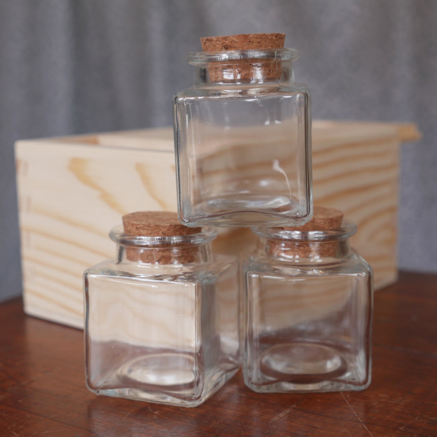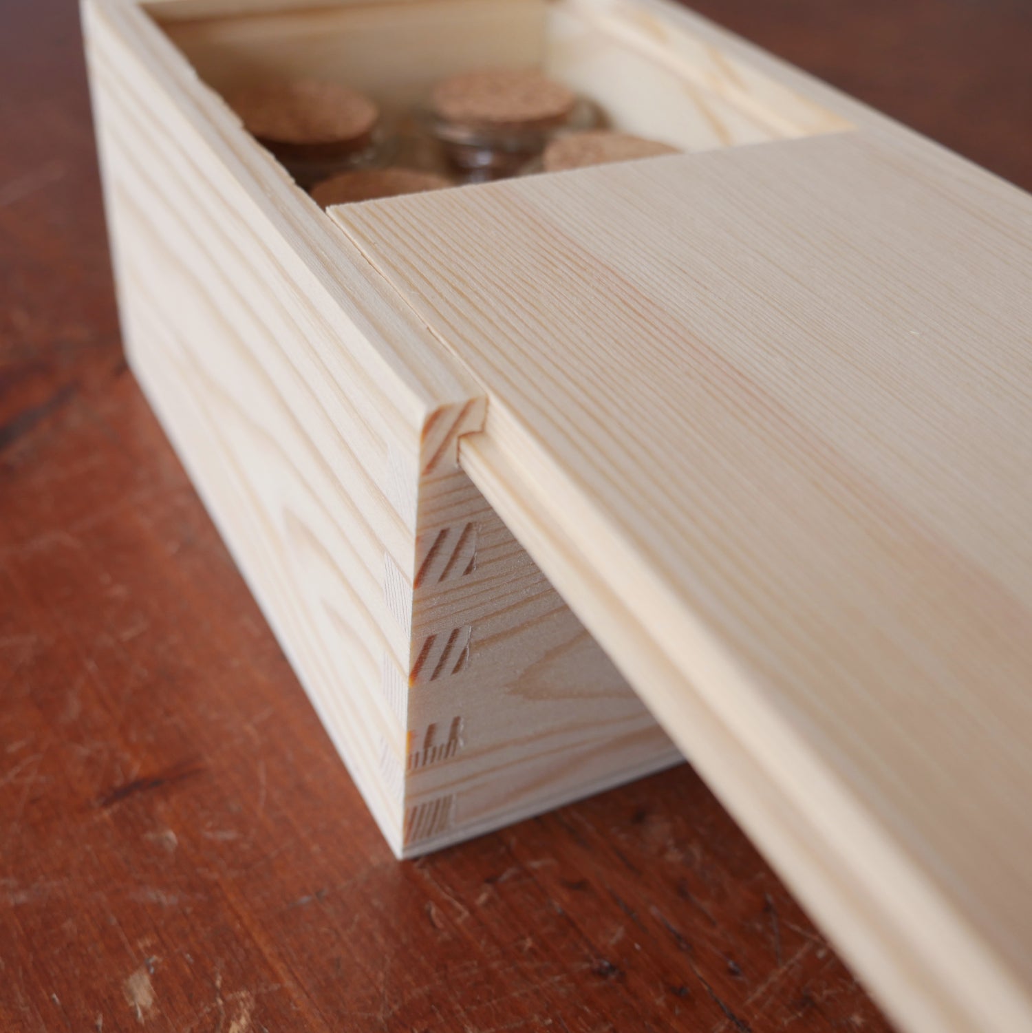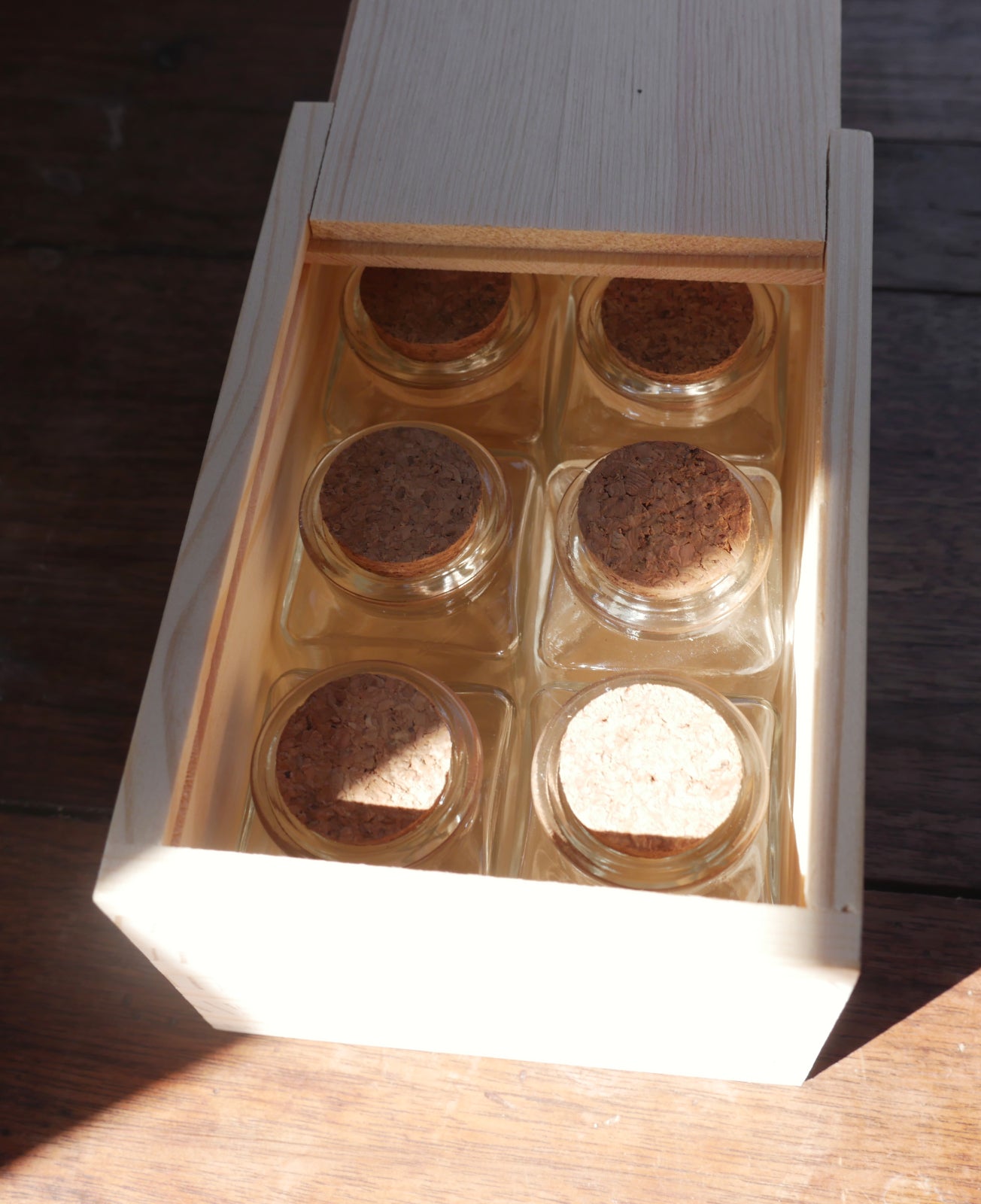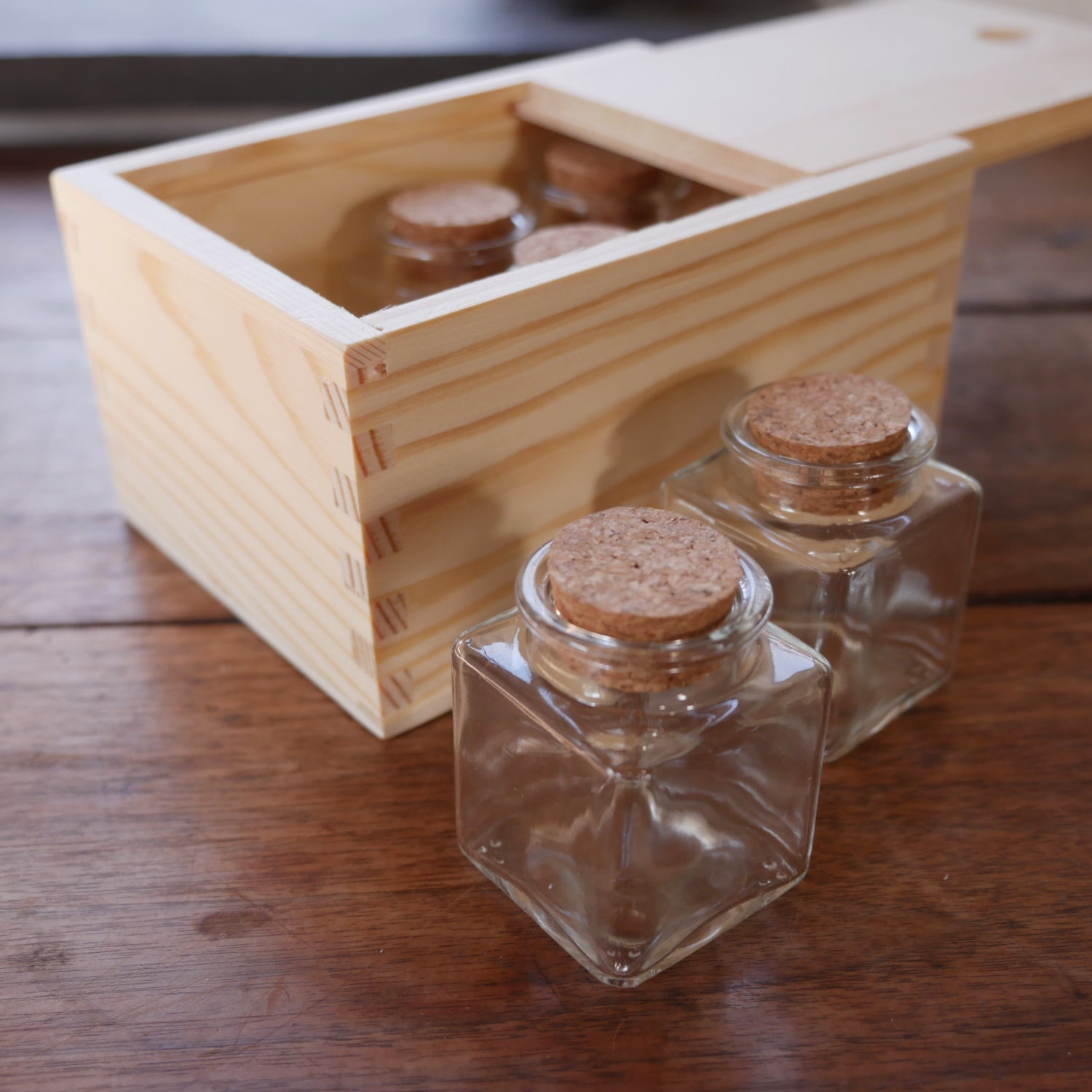 These slide-topped wooden boxes comes with a set of six 2 ounce glass bottles with corks, great for storing spices or other items. Interior dimensions 5-7/8" long 4-1/8" wide 2-7/8" tall. Imported from India