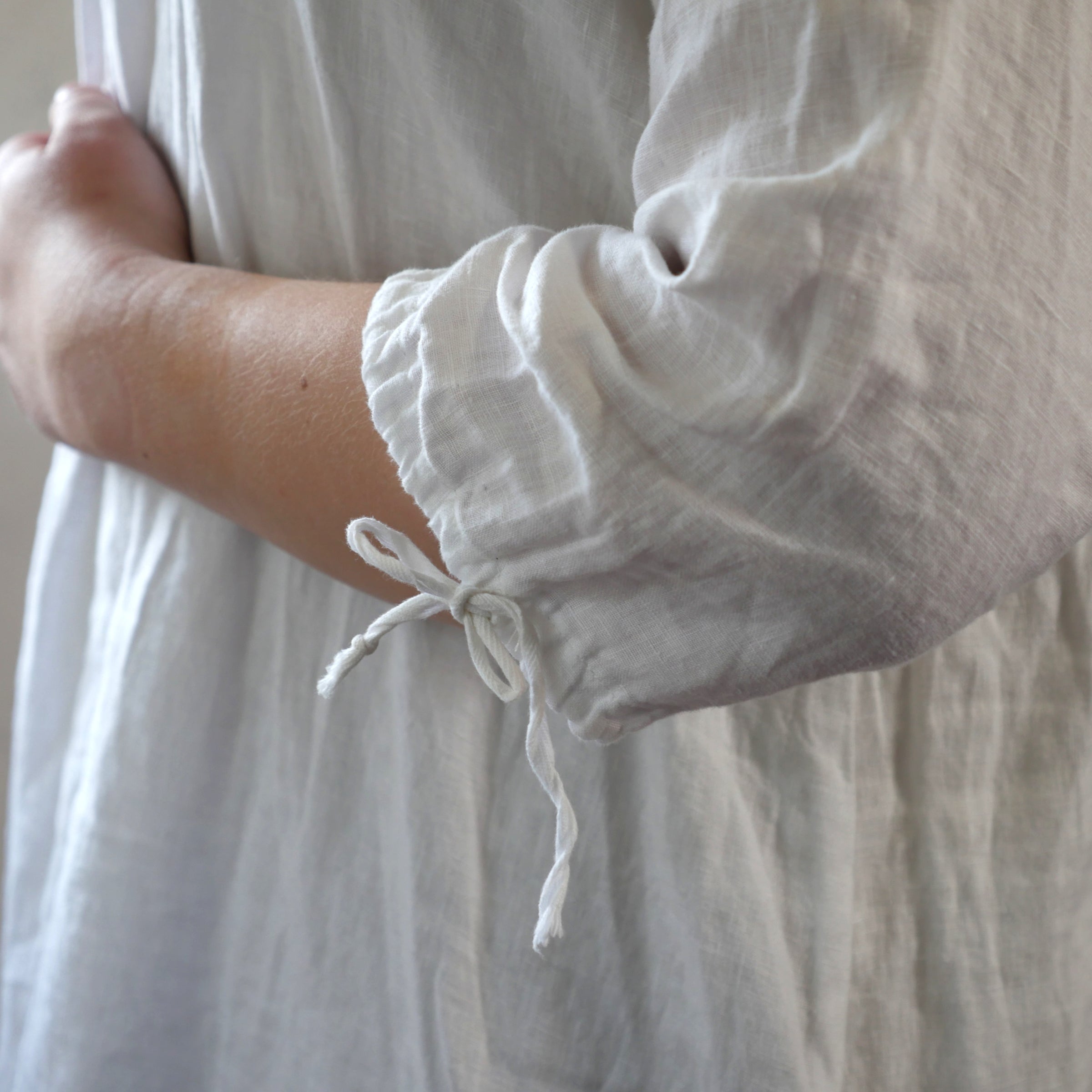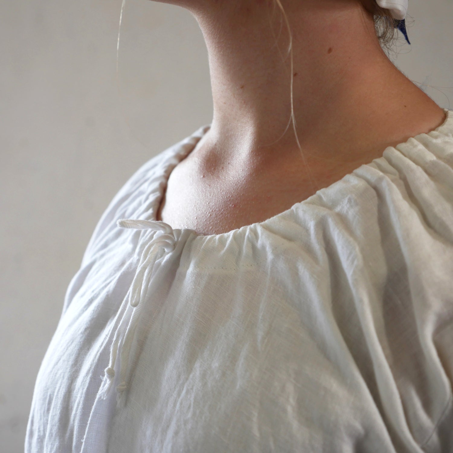 Also called a shift. Worn night and day by 18th century women as the main undergarment. It was never worn in public without a bodice or a gown covering it. Generously cut. Made of white linen with a drawstring at the neck and sleeves.