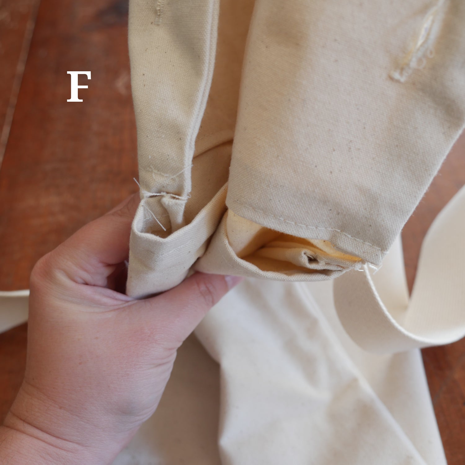 F: Long strap, inside opening doesn't meet the top on both sides so it is sewn with an extra length to one side