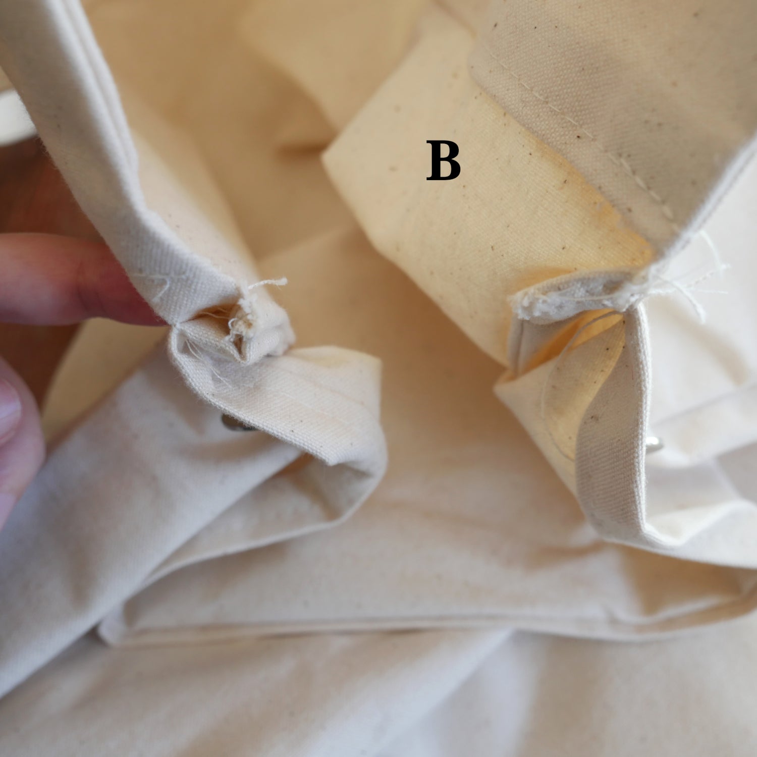 B: Standard strap, inside opening doesn't meet the top on both sides so it is sewn with an extra length to one side