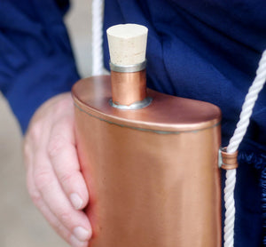Kidney shaped style documentable from French and Indian War period. Also good for Revolutionary War. 8" high including spout, 5" wide. Holds about 1 quart. Made of tin-lined copper. Cord strap and stopper included, but may vary from what is pictured.