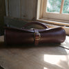 Handmade locally from quality leather by skilled leather craftsman. Perfect for carrying important documents or personal items. Measures 15” long by 4-1/4” in diameter. Colors may vary.