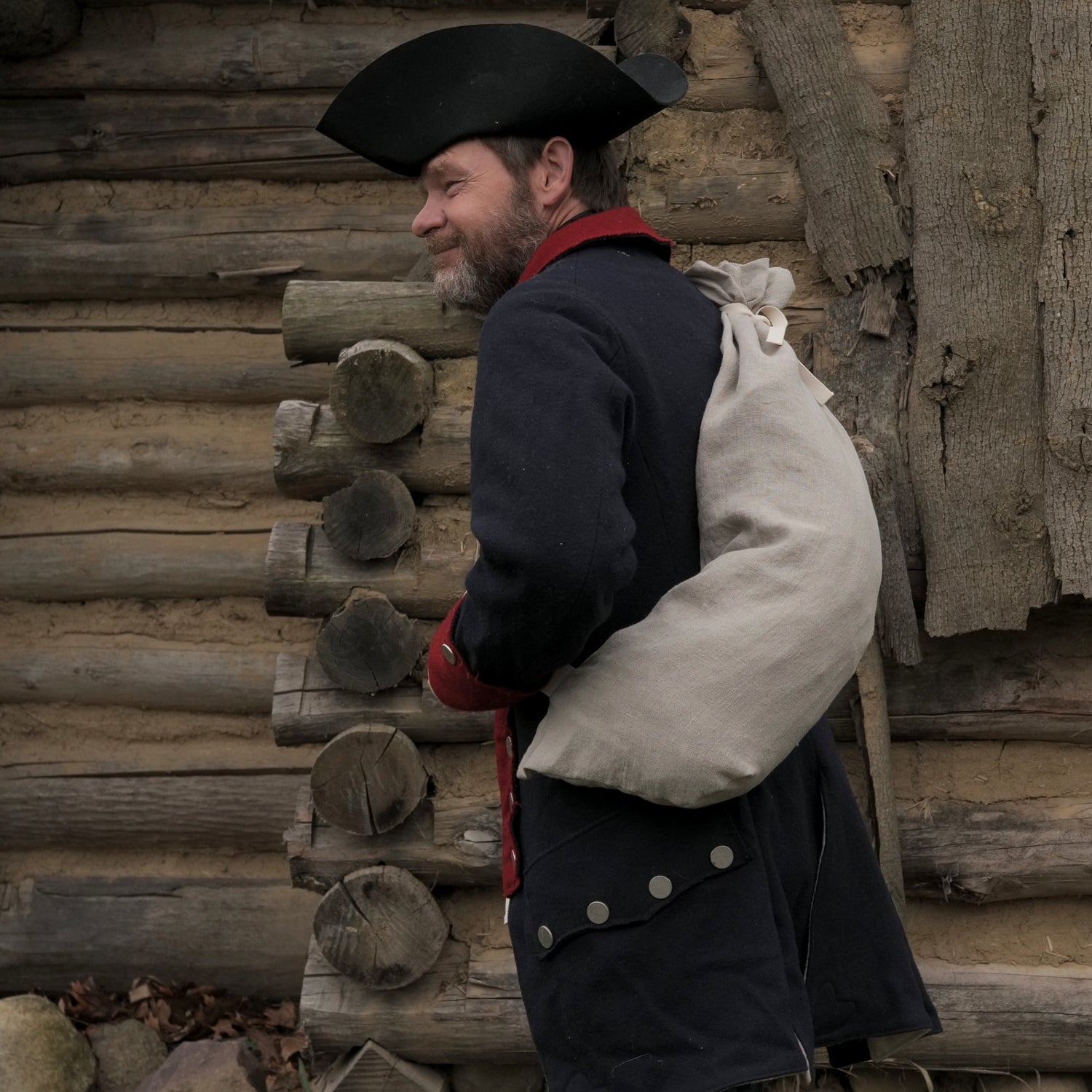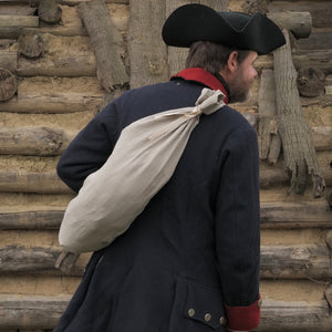 This tubular shoulder bag is easily documented in 17th century artwork, however, there is some debate about how long this style of bag endured into the 18th century. While the word “snapsack” is mentioned in late 18th century inventories and militia regulations, by as early as 1754, dictionaries suggest the word had taken on a more generic meaning describing any type of soldier’s bag including even haversacks. The stomach-shaped description given in the Royal Society’s 1742 book, “Philisophical Transactions and Collections” matches depictions in paintings and prints as late as 1755. You be the judge on this one, but our recommendation is that this style is best for the period prior to the 1760s. Made with Natural Linen. It measures 11” at it’s widest spot by 32” long. The shoulder strap is durable cotton webbing made adjustable with a double-D brass buckle. The ties are sewn into the seam so they can’t be lost. - Picture shows cotton canvas version.