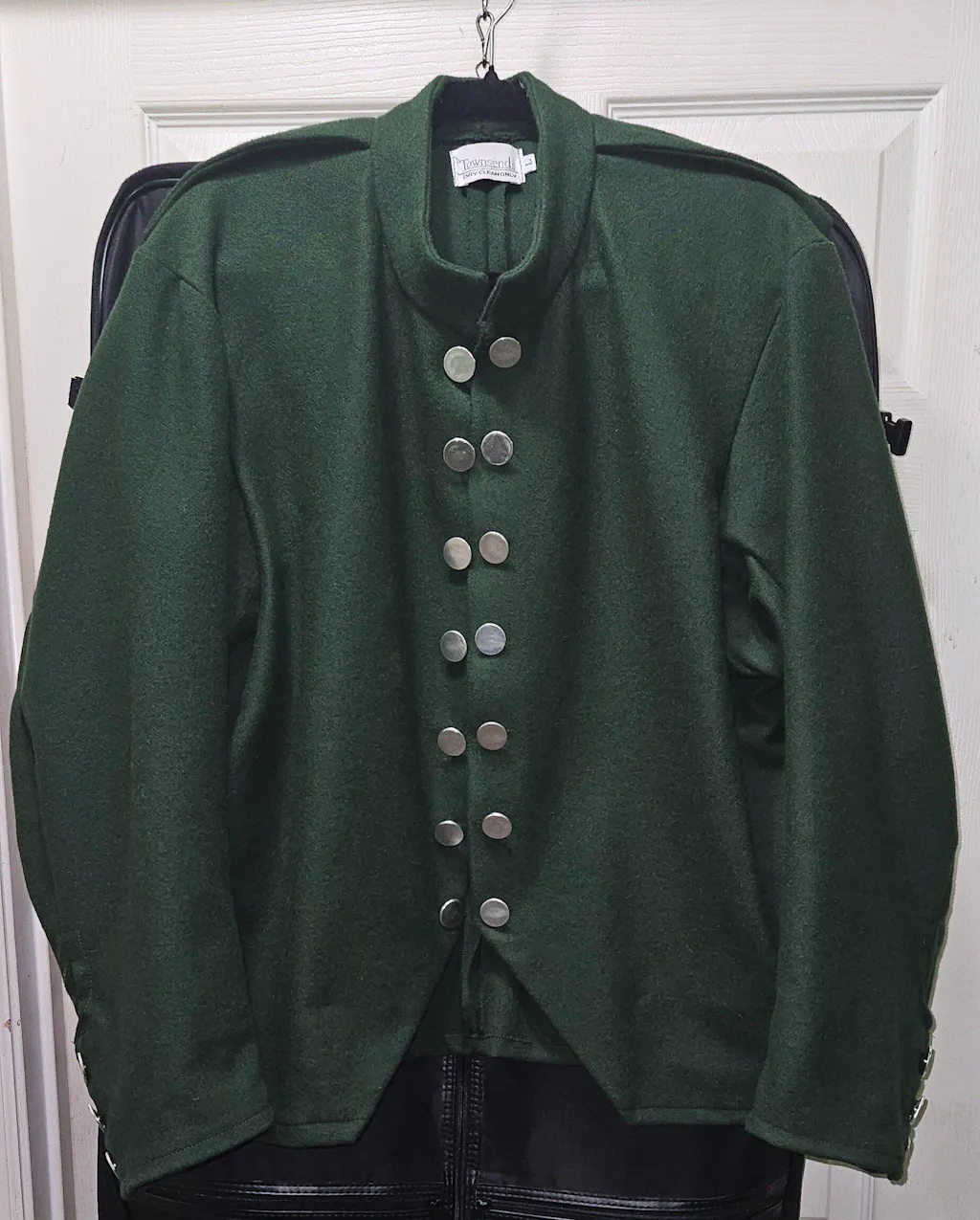 I bought the woolen short jacket in dark green 2.5 months ago to wear with a kilt I'd ordered a couple of weeks earlier. Shipping on the jacket was quick, and I initially thought it was a great jacket. It fits well, looks good, and is warm. It's a little itchy, but that was to be expected as it's un-lined. My kilt took 3 months to get to me, and I only wore the jacket a handful of times before my kilt arrived to see how well it fit and did in the cold. After my kilt arrived a week ago, I started wearing the jacket every morning when it was chilly out. After just a few days, the stitching on the button holes was shredded, 2 buttons were really loose, and 1 button fell off completely. I never found the one that fell off because it was dark out and it fell off to the side of the road. Luckily, I'd bought extra buttons in case something like that happened. I've also noticed some of the other stitching in random places is coming loose. I'm not abusing this jacket, but it already looks like I've owned it for years and have treated it harshly. I'm rather disappointed considering how much I paid for this jacket. I can't return it, especially since I've made some modifications to it so it looks and works better with a kilt. I added a banded collar and epaulettes, then angled the front bottom to accommodate a sporran. The only option I had was to replace the missing button, secure the remaining buttons better, tear out the remaining stitching around the button holes, iron some interfacing behind the holes to seal them shut, put buttons in place over the holes, then get clip on chains to hold the jacket closed when it's cold outside. It actually looks better that way with a kilt, anyways. That's a lot of extra work, time, and money. I expected much better quality for the amount I paid. Several people in groups I'm in asked me to let them know what I thought of this jacket for use with a kilt. Sadly, I'd have to tell them not to get it unless they know how to fix the issues that will arise after just a couple of months of very light use.